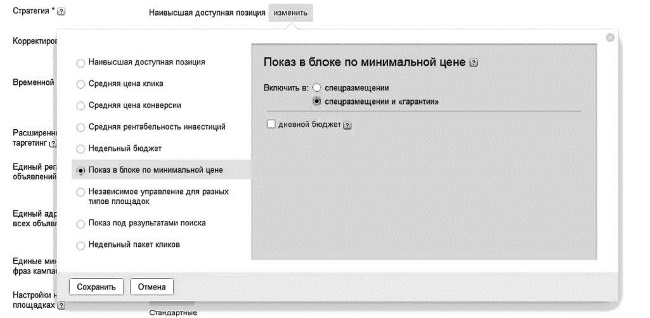 Нам с вами, пока мы не научились хорошо разбираться в контекстной рекламе, следует воспользоваться ею первый раз, да и вообще не знаем что с ней делать, и боимся потратить весь свой рекламный бюджет впустую, лучше всего поставить стратегию Показ в блоке по минимальной цене и Спецразмещения и гарантии.