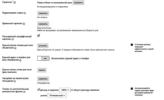 Вы можете управлять ставками во всей кампании. Допустим, вы знаете, что люди у вас на сайте больше всего оставляют заявок с 12.00 до 20.00. Тогда в это время можно поднимать ставки, а в остальное понижать. Я в этом разбираюсь очень плохо, поэтому оставила круглосуточные показы.