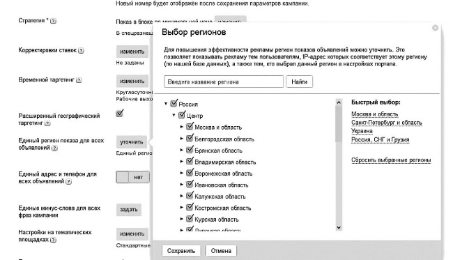 Далее следует Единый регион показов, или Геотаргетинг. Единый регион показов необходим для ограничения показов рекламных объявлений только по данному региону. То есть если вы предлагаете услуги только по городу Норильску, то регион показов следует выставить Норильск. Не нужно, чтобы Ваши объявления видели люди в Саратове или Пензе. Это лишние деньги. И вообще, директ – это такая штука: поставил или не поставил неправильно одну галочку – и денежки со свистом улетают в никуда. В данном случае в бане парятся везде, так что мы выберем регион Россия.