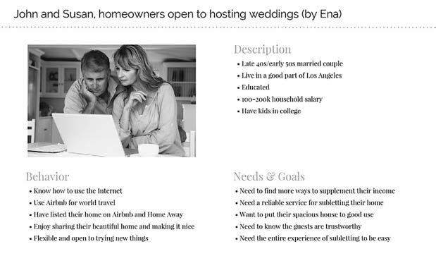 На основании персонажа Биты, ее отборочные вопросы должны были определить, приходилось ли женщине, с которой она разговаривала, планировать свадьбу в Лос-Анджелесе в последнее время. Ей были нужны участники со свежими воспоминаниями о своих свадьбах. Кроме того, свадьба должна была проводиться в солнечной Южной Калифорнии, то есть скорее всего проходила на открытом воздухе – в парке, на побережье или где-то еще. Эта подробность была важна для проверки предлагаемой ценности «Airbnb для свадеб», потому что Бита предполагала, что эти места на открытом воздухе (скажем, частная территория с выходом на пляж) решили бы проблемы потенциальных участников с поиском места для проведения свадеб.
