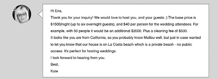 На следующей неделе Эна вернулась с довольно изящным решением (рис. 3.8). Она выдала себя за будущую невесту и связалась с реальными хозяевами домов на Airbnb. Она спросила, не пожелают ли они сдать свои дома для проведения свадьбы. Она даже спросила, сколько это будет стоить. И как оказалось, хозяева домов уже предоставляют такую услугу.