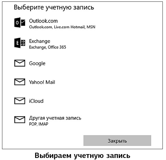 После того как вы нажали на Добавить учетную запись, откроется окно с выбором вариантов. Нажмите на один из них. (Чаще всего используют Outlook.com, Google, Yahoo! Mail. Самый нижний вариант – Другая учетная запись – позволяет создавать почту с названием других почтовых серверов, но это более сложная задача, и сейчас рассматривать этот вариант мы не будем.)