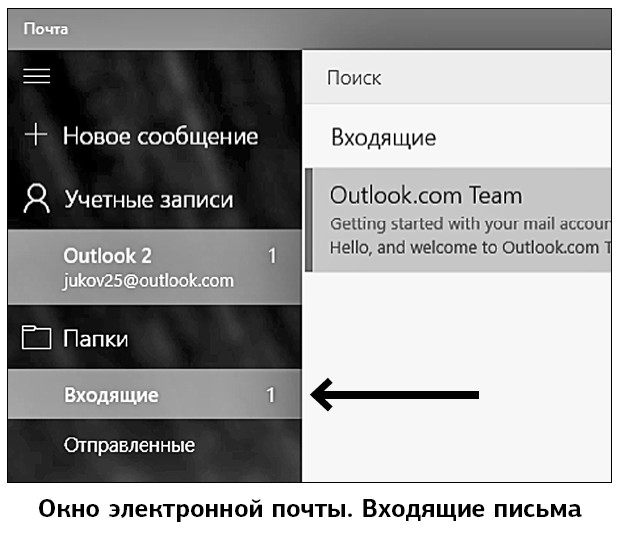 ? Слева в столбике под надписью Входящие будут появляться новые письма. Самое верхнее из них – самое последнее по времени. Сначала будет написано, от кого пришло письмо (у нас с вами это Приветствие от Outlook.com), а затем первые несколько слов письма. В строчке письма, справа, указана дата и время получения письма.