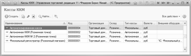Следует учитывать, что в программе «1С Управление торговлей 8.2» рассматривается два вида касс. К первому относятся те кассы предприятия, которые предназначены для учета и хранения всех наличных денежных средств предприятия (о них мы говорили ранее, см. в главе 5 раздел «Кассы предприятия»). Что касается второго вида касс, то они предназначены для розничной торговли (кассы ККМ), и именно о них мы будем говорить в данном разделе. Отметим, что денежные средства (наличная денежная выручка) сдаются из кассы ККМ в кассу предприятия, а уже из кассы предприятия они могут сдаваться в банк на оприходования на расчетный счет или расходоваться на иные цели, в соответствии с действующим законодательством.