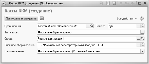 Завершается процесс регистрации кассы ККМ нажатием кнопки Записать и закрыть или с помощью комбинации клавиш Ctrl+Enter.