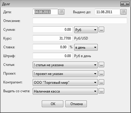 Для ввода информации о новом долге следует нажать кнопку Новый долг – в результате на экране откроется окно, изображенное на рис. 1.14.