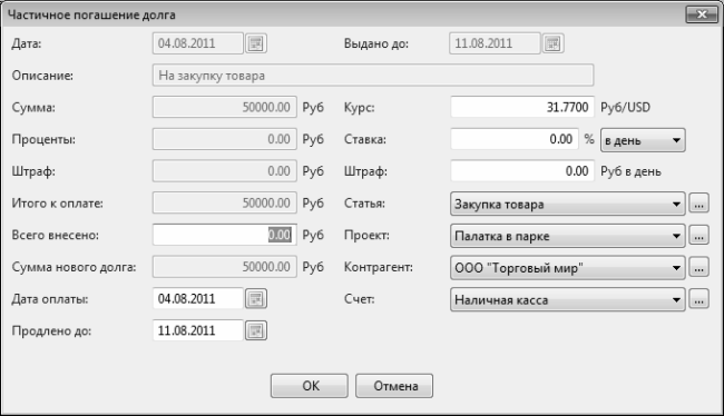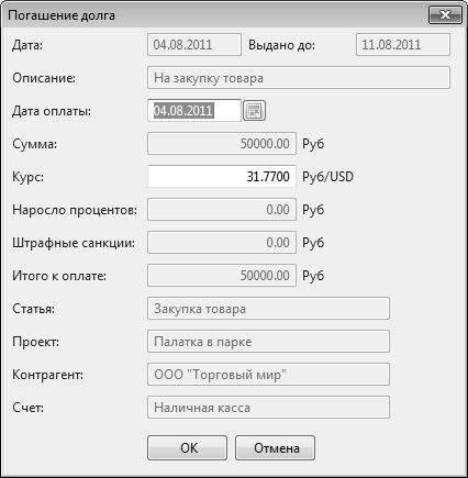 В данном окне отображается вся имеющаяся информация о текущем долге: дата выдачи денег в долг, срок его погашения, реальная дата погашения, сумма с учетом процентов и штрафных санкций, а также статья, проект и контрагент. Для полного погашения долга следует в данном окне нажать кнопку ОК – в результате в списке долгов в колонке Состояние долга для данной позиции отобразится значение Погашен.