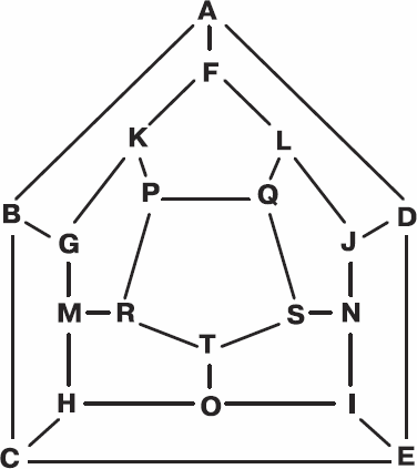 Эта головоломка – частный случай второй игры со скипетром. Представьте, что вершины додекаэдра соответствуют жителям Королевства, а ребра соединяют друзей, – и получите самую настоящую схему дружеских связей. Сумеете сами обойти додекаэдр и решить вторую игру со скипетром? Ответ вас ждет в конце главы.