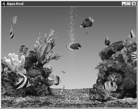 После установки программы ее подменю появится в составе меню Пуск?Все программы; кроме этого, на рабочий стол будет установлено два ярлыка. Один ярлык (его название по умолчанию – Aqua Real) предназначен для запуска экранной заставки в полноэкранном режиме – содержимое рабочего стола при этом будет недоступно (в таком режиме обычно работают хранители экранов). Второй ярлык (его название по умолчанию – Aqua Real Active Desktop) предназначен для запуска программы в режиме фонового изображения рабочего стола – в данном случае будет доступно все содержимое рабочего стола (значки, ярлыки и т. п.), и можно работать с системой в обычном порядке.