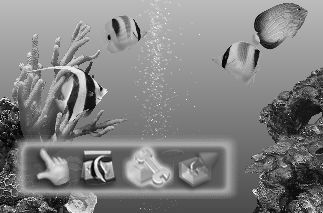 На рисунке видно, что данная панель состоит из четырех кнопок. Крайняя слева кнопка предназначена для выбора такого же указателя мыши для работы в программе, который изображен на этой кнопке. Следующая кнопка позволяет «покормить» рыбок. После нажатия на нее указатель мыши превращается в своеобразный «пакетик», и при каждом щелчке мышью из этого пакетика «высыпается» некоторое количество «корма».