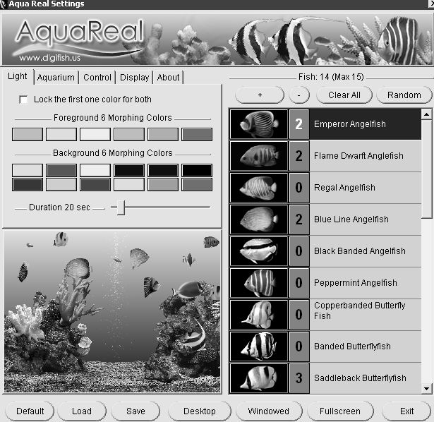 В правой части окна осуществляется выбор рыбок, которые будут «плавать в аквариуме», а также определяется количество каждого вида рыбки. Общее количество всех рыбок в аквариуме не может превышать 15 штук. Чтобы добавить рыбку в аквариум, следует выделить ее курсором – при этом количество рыбок данного вида автоматически увеличится на единицу. Для добавления и удаления рыбок можно также использовать кнопки с плюсом и минусом, расположенные над перечнем рыбок. С помощью кнопки Clear All осуществляется быстрое удаление из аквариума всех находящихся в нем в данный момент рыбок. Кнопка Random предназначена для случайного включения тех либо иных рыбок в аквариум (в любом случае общее количество рыбок в аквариуме будет не более 15).