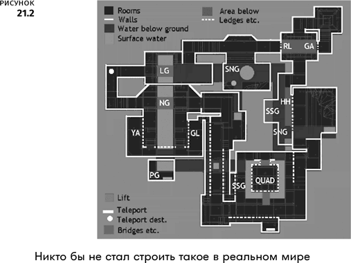 Все потому, что человеческий мозг довольно слаб, когда дело касается переноса трехмерного пространства на двухмерные карты. Если вы не верите мне, то представьте себе знакомое место, в котором вы часто бываете: дом, школу или офис, – и попробуйте нарисовать карту этого места. Многим людям это задание покажется трудным. Дело в том, что наш мозг хранит информацию об этих пространствах в другом виде – мы представляем их как относительные, а не абсолютные сущности. Мы знаем, какая дверь ведет в ту или иную комнату, но что именно находится за стенкой без двери – мы не знаем. Именно поэтому совсем не важно, чтобы трехмерные пространства имели реалистичные двухмерные аналоги. Важно лишь то, что ощущает игрок, находясь в пределах этих пространств.