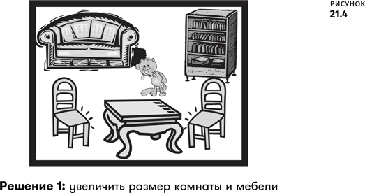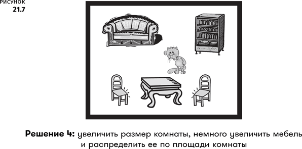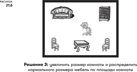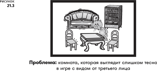 Решение 4: увеличить размер комнаты, немного увеличить размер мебели и распределить ее по площади комнаты. Это решение придумал создатель Max Payne. Возможно, с видом от первого лица это выглядит немного странно, но с видом от третьего лица решение работает отлично: мы избежали искажения пространства, возникающего из-за того, что глаза смотрящего находятся далеко от тела.