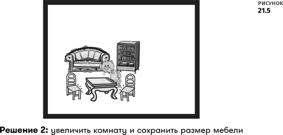 Решение 1: увеличить размер комнаты и мебели. Если расширить стены и увеличить мебель, комната покажется больше, но в то же время это создаст странное ощущение, что ваш аватар выглядит как маленький ребенок, потому что привычные объекты, такие как стулья и диван, слишком большие для него.