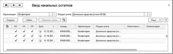 В данном окне представлен список документов на ввод начальных остатков по разделу учета Денежные средства, объединяющему счета с 50 «Касса» по 58 «Финансовые вложения» включительно. Иначе говоря, если вы вызовете данное окно для любого счета в диапазоне от 50 до 58, его содержимое будет одинаковым: в нем будет представлен перечень документов на ввод начальных остатков по всем этим счетам.