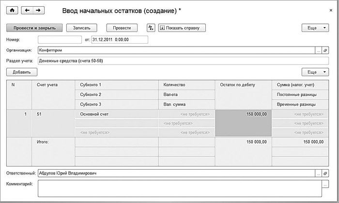 Чтобы сохранить введенные данные, нажмите комбинацию клавиш Ctrl+S или кнопку Записать, расположенную справа внизу окна. Чтобы провести документ по учету, нажмите кнопку Провести.