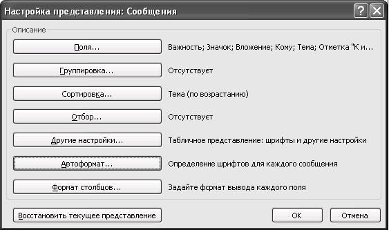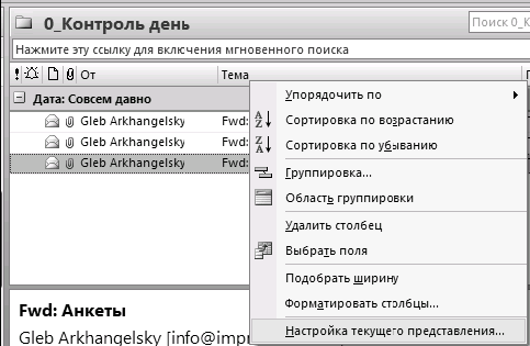 1. В папке «Входящие» кликните правой кнопкой мыши на сером поле «Тема» над письмами и выберите в контекстном меню пункт «Настройка текущего представления» (в Outlook 2003 «Изменить текущее представление»).