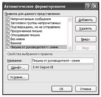Иногда хочется настроить автоформатирование по нескольким признакам сразу – по проекту, человеку, категории и т.п. В таких случаях, если правила автоформатирования конфликтуют (например, одно пытается раскрасить письмо в красный цвет, другое – в зеленый), приоритет будет отдан тому, которое стоит ближе к началу списка правил. Поэтому можно применить маленькую хитрость: например, письма от руководителя выделять крупным шрифтом, а по приоритетному проекту – красным цветом. Тогда письмо от руководителя по приоритетному проекту окажется одновременно и крупным, и красным.