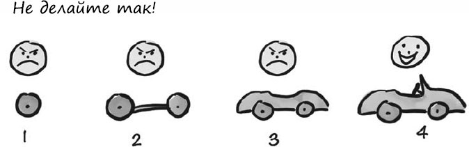 Вот простая иллюстрация, нарисованная моим другом Хенриком Нибергом, – здесь отлично показана ситуация, когда из-за неверной релизной стратегии с каждым выпуском пользователь получает нечто, что не может использовать, пока в последнем релизе не выпустят наконец что-то полезное.
