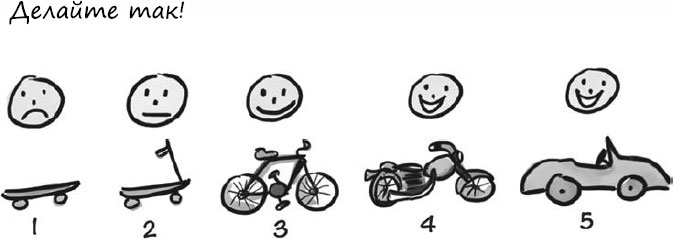 Если я планирую свои релизы по этому принципу, то с каждым выпуском люди получают что-то, что могут реально использовать. Если я, как в этом простом примере, хочу передвигаться на большие расстояния, да еще и таскать с собой какие-то вещи, а вы даете мне скейтборд, я, конечно, буду не слишком доволен. Я скажу вам, как сложно будет уехать далеко на этой штуке, хотя, уверен, есть и любители кататься на скейтборде по автомобильным дорогам. Если вы хотели мне угодить, то, возможно, несколько огорчитесь, но ваша настоящая цель – исследование. Поэтому все нормально: вы узнали, что я хотел бы иметь возможность путешествовать на более дальние расстояния и, кроме того, делать это с комфортом.