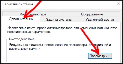 Выберите вкладку «Дополнительно» и нажмите «Параметры» в разделе «Быстродействие»: