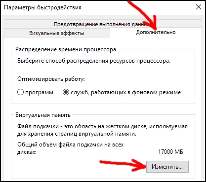 После этого выберите вкладку «Дополнительно» и нажмите «Изменить» в разделе «Виртуальная память»: