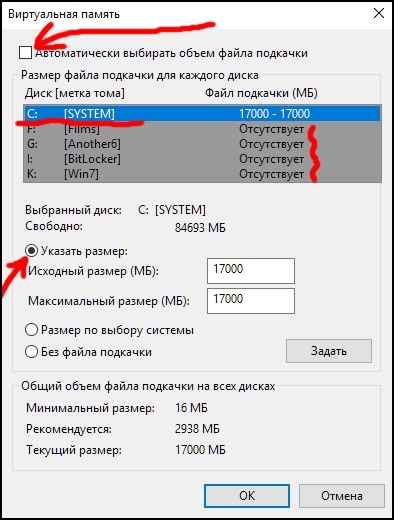 В том же самом окне выберите опцию «Указать размер», как показано выше, затем выберите системный диск (C) и установите размер файла подкачки на 110–125% от размера вашей ОЗУ. Изучите свои другие диски в списке и по очереди измените их размер файла подкачки на ноль. Я предполагаю, что ваш системный диск (C) является твердотельным диском, а все остальные представляют собой стандартные диски. Нажмите «ОК» несколько раз, чтобы закрыть все диалоговые окна. Изменения вступят в силу после перезагрузки компьютера.