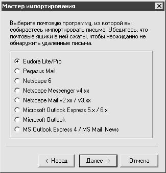Кроме этого, имеется возможность импорта электронной корреспонденции из других установленных на компьютере почтовых программ. Для этого следует воспользоваться командой Инструменты?Импортировать письма?Мастер импортирования – в результате на экране откроется окно, изображенное на рис. 3.20.