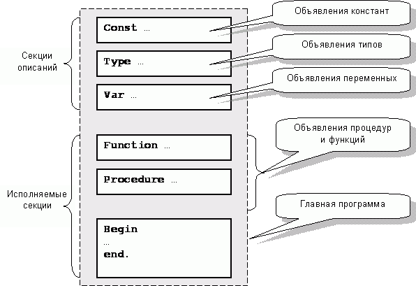 • Программа состоит из ряда секций. Секции описания констант, типов и переменных нужны для размещения данных. Исполняемые секции содержат процедуры, функции и главную программу.