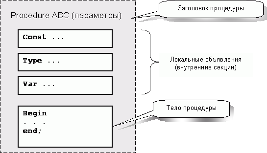 Внутренняя структура процедур и функций схожа со структурой программы. Это своего рода программы в программе, потому их и называют подпрограммами. На рис. 79 показана упрощенная структура процедуры с условным именем ABC.