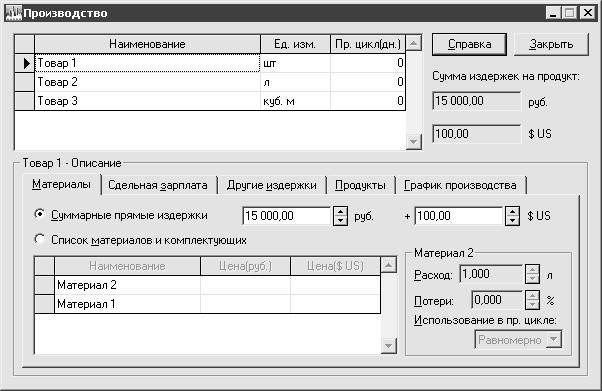 На вкладке Материалы (см. рис. 4.55) вводится информация о материальных затратах на производство единицы продукции, на которой в списке установлен курсор. В первую очередь с помощью переключателя нужно указать, каким образом будет отражаться сумма материальных затрат. Если переключатель установлен в положение Суммарные прямые издержки, то сумма материальных затрат в основной и дополнительной валютах вводится пользователем в расположенных правее полях с клавиатуры либо с помощью кнопок счетчика.