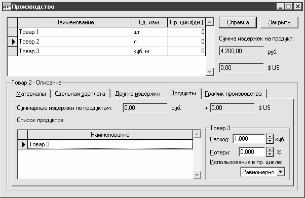На практике нередко могут возникать ситуации, когда те либо иные товары, выпускаемые производственным предприятием для продажи, используются на этом же предприятии в качестве компонентов для производства других видов продукции. Для ввода информации о затратах, связанных с использованием в производстве подобных продуктов, предназначена вкладка Продукты (рис. 4.56).