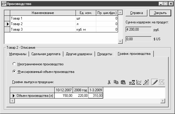 Содержимое данной вкладки относится к той позиции списка продуктов, на которой установлен курсор. Например, на рис. 4.57 формируется производственный график для продукта Товар 2.