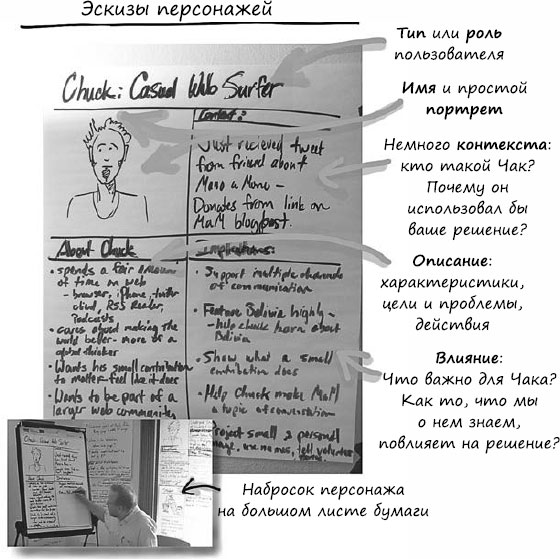 Мне нравится быстро набрасывать эскизы упрощенных персонажей вместе с небольшой исследовательской командой, чтобы выработать одинаковое понимание пользователей. Персонаж – это пример целевых пользователей, в описании которого использованы факты, а порой и предположения о ваших пользователях. Создание персонажей помогает нам взглянуть на программный продукт глазами пользователей, поэтому создание персонажей – очень полезная техника.