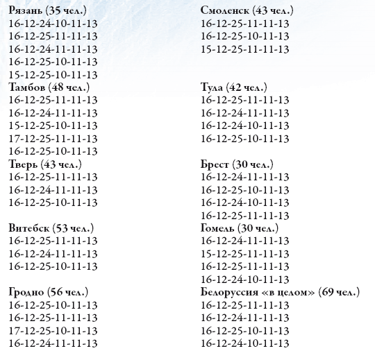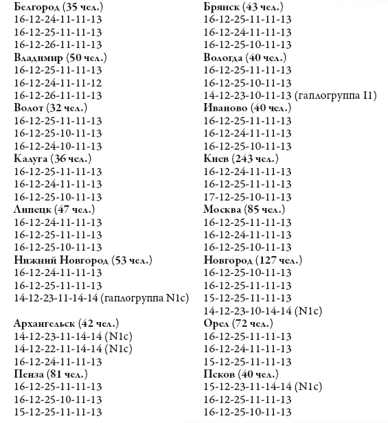 Наиболее распространенные гаплотипы в старинных русских и других славянских городах, но в основном в их областях, в «глубинке». В скобках указано количество тестированных человек. Там, где не указано, – это все гаплогруппа R1a1, потомки древних ариев. Там, где указано, – гаплогруппа I1 (прибалтийская, скандинавская, северогерманская, саамская), гаплогруппа N1с (северная, поморская, финская, уральская).