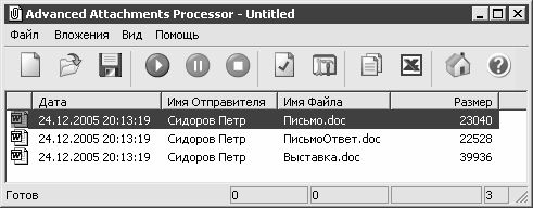 На рис. 5.3 показан пример созданного проекта – в данном случае в обрабатываемой папке почтовых сообщений было три вложения. Каждое из вложений можно открыть – для этого нужно выделить требуемое вложение курсором и дважды щелкнуть мышью либо выполнить команду главного меню Вложения?Открыть.