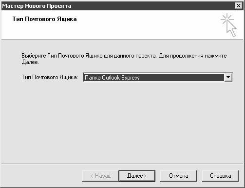 ? На первом этапе (рис. 5.4) следует указать тип почтового ящика, содержимое которого должно быть обработано. Требуемое значение выбирается из раскрывающегося списка, который включает в себя перечень популярных почтовых программ. Следует выбрать ту программу, из которой нужно извлечь и обработать вложения (иначе говоря – здесь указывается используемая почтовая программа).
