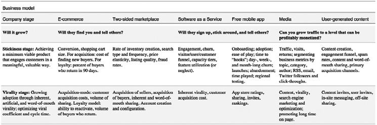 Строки матрицы воронки описывают стадии вовлечения пользователя в ваш цифровой продукт. Названия стадий должны четко соответствовать бизнес-модели продукта (рис. 9.5). Разным продуктам для роста требуются разные средства. В книге Lean Analytics[61] приведена замечательная таблица, к которой я часто обращаюсь при работе со строками.