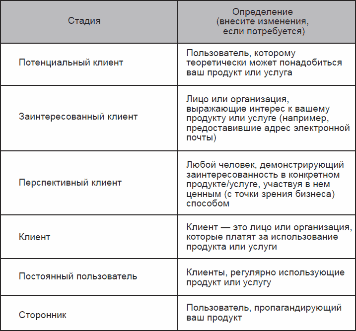 Прежде чем определять другие стадии, попробуйте разобраться с первой строкой (особенно если вы недавно занимаетесь методами customer development). Рассмотрев необходимые действия, вы поймете, что определения непосредственно связаны с вашей стратегией вовлечения пользователей в процессе того, как пользователи начинают знакомиться с вашим продуктом. Затем двигайтесь сверху вниз. Заголовки столбцов представляют собой различные факторы, которые вы должны обсудить со своей командой. Я расскажу о них подробнее далее в этой главе.
