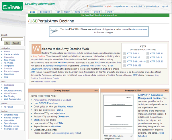 Американским военным предложили организованно отправиться в Интернет (используя особые идентификационные карты для входа в закрытый армейский сегмент Сети), чтобы внести свой вклад в соответствующую базу знаний. Семь полевых уставов (боевых наставлений) армии США в качестве эксперимента уже представлены онлайн в вики-формате.