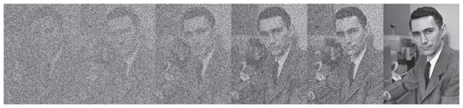 Здесь тоже постепенно «вырисовывается» второе загаданное слово, но уже не в виде букв, а в виде ряда фотографий с различной степенью четкости изображения. При передаче информации могла произойти частичная ее потеря. Как вы помните, Шеннон создал методы кодирования с коррекцией ошибок, чтобы информация при ее передаче по каналам связи и дешифровании не пропадала. Итак, задуманная фраза: «Энтропия Шеннона». По всеобщему мнению, именно работы Шеннона в области теории кодирования и передачи информации придали криптографии статус науки.
