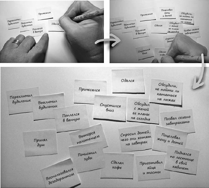 Закройте глаза и вернитесь к моменту пробуждения сегодня утром. Вы же проснулись сегодня утром, правда? Что вы сделали прежде всего? А сейчас откройте глаза и запишите это действие на стикере. Я тоже сделаю это: мое первое действие сегодня утром было «Переключил будильник», что я и написал на бумажке. Не слишком интересно, правда? Хотя бывают дни, когда мне приходится переключать будильник два или три раза.