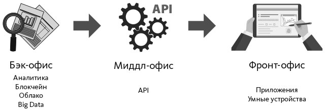 В индустриальную эпоху банк полностью владел всеми тремя этими уровнями, они были собственностью банка, его внутренними подразделениями. Теперь они становятся открытыми и отделяются от него. Отношения, которые поддерживались во фронт-офисе, теперь развиваются в мобильных устройствах. Автоматически конфигурируемое программное обеспечение, используемое для любых операций, позволяет каждому предложить собственный код через API и улучшить взаимодействие миддл-офиса с бэк-офисом и фронт-офисом, а сами эти API и приложения наполняются данными, которые хранятся в облаке и извлекаются при помощи машинного обучения и искусственного интеллекта.