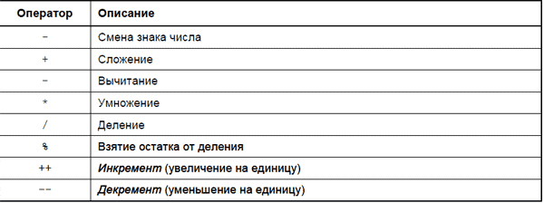 Арифметические операторы делятся на две группы: унарные и бинарные. Унарные операторы выполняются над одним операндом; к ним относятся операторы смены знака, инкремента и декремента. Унарный оператор извлекает из переменной значение, изменяет его и снова помещает в ту же переменную. Приведем пример выражения с унарным оператором: