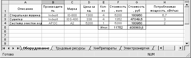 Для работы химчистки необходимы не только стиральные машины, но также и сушилки, а еще – система очистки воды (для обеспечения экологической безопасности). Укажем для каждого вида оборудования его производителя, марку, цену в евро, количество, стоимость в евро и в рублях, а также потребляемую мощность согласно паспорту на изделие. Отметим, что большинство введенных на листе Оборудование данных не будет использоваться в расчетах: просто эта информация (производитель, марка, и др.) должна быть в бизнес-плане, поскольку она в любом случае интересна для потенциального инвестора (делового партнера).