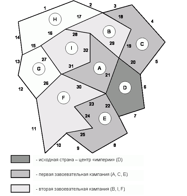 Вам приходилось строить империи? Тогда послушайте меня – опытного «императора». Строительство начинается с собственной страны – центра империи. Я готовлю мощную армию и накапливаю прочие ресурсы: оружие, горючее, продовольствие. Все это нужно для «добровольного» присоединения соседей. Затем нападаю на них и покоряю поодиночке. После такой завоевательной кампании рождается новая страна с расширенными границами и другими соседями, которые ещё не ведают о своей судьбе! Дав отдых армии, и накопив ресурсы, я предпринимаю следующую завоевательную кампанию и присоединяю соседей своих бывших соседей. Взгляните на рис. 112, – если строительство империи начать из страны D, то в ходе первой кампании будут поглощены соседи A, C и E, а в ходе второй – их соседи, – страны B, I и F.