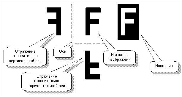 Кто не любовался яркой световой рекламой? Рекламный щит составлен из лампочек, а изображение «рисуется» их включением и отключением, – этим управляет микропроцессор. Компьютер у нас под рукой, почему бы не соорудить такой рекламный щит прямо на экране? Научим компьютер выполнять с изображением на нашем щите три действия: два зеркальных отражения (относительно горизонтальной и вертикальной осей), а также инверсию изображения (рис. 113).