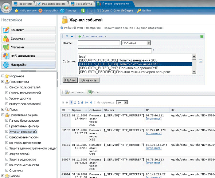 Традиционный способ защиты – постоянное обновление ПО, а также ручной мониторинг журналов доступа, с тем, чтобы в предельно короткие сроки заблокировать подобную деятельность. В 99% случаев процедура ответной реакции предполагает вполне фиксированный набор действий: запрет доступа с IP-адреса, откуда ведется атака, реже – коррекция данных, передаваемых в сеансе связи. Работа нудная, рутинная и неплохо поддающаяся автоматизации. Что, собственно, и сделали разработчики «1С-Битрикс».