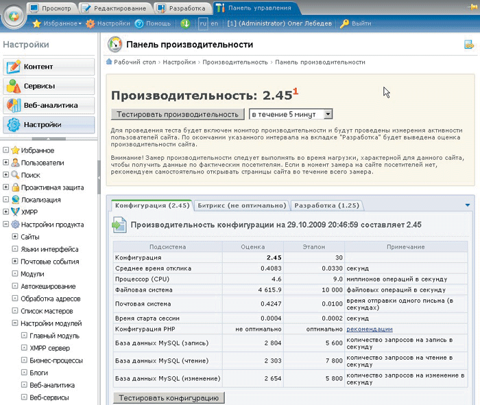 Самое интересное – возможность рассчитать сводный индекс производительности (идея примерно та же, что и Windows Vista с ее Windows Perfomance Index). Оценка формируется довольно замысловатым образом, но это не очень важно – важно, что она единая. Одинаковая для всех. Как известно, на «1С-Битрикс» часто ссылались недобросовестные разработчики или поставщики услуг Интернета, мол, если сайт тормозит, «чего же вы хотели, это же Битрикс». Раньше клиенту только оставалось смириться, теперь можно посмотреть и однозначно установить, чьи недоработки стали причиной снижения быстродействия.