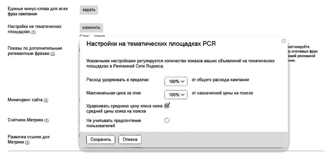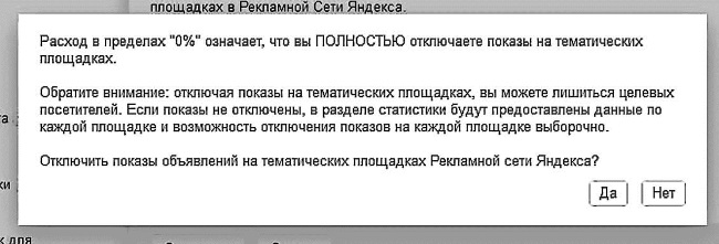 Наша кампания настраивается на поиск, поэтому показы в рекламной сети Яндекс необходимо отключить. Для этого параметр «Расход удерживать в пределах» ставим 0 %. Яндексу это очень не нравится. Он начинает капать на мозги, но мы все равно нажимаем Да.